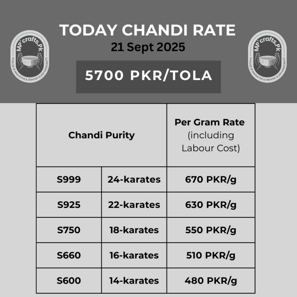 PLEASE NOTE: THE PRICE OF SILVER FLUCTUATES DAILY DUE TO CHANGES IN THE INTERNATIONAL MARKET. DUE TO THIS PLEASE CONTACT US FOR THE EXACT PRICE OF YOUR DESIRED ITEM. YOU CAN ALSO CALCULATE BY MULTIPLYING THE WEIGHT OF THE PRODUCT WITH TODAY PER GRAM RATE ACCORDING TO THIS TABLE. THANK YOU.