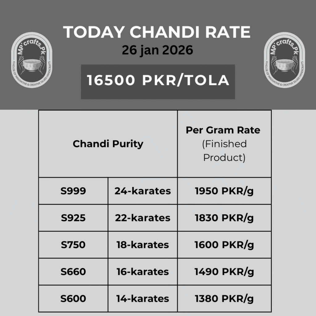 PLEASE NOTE: THE PRICE OF SILVER FLUCTUATES DAILY DUE TO CHANGES IN THE INTERNATIONAL MARKET. DUE TO THIS PLEASE CONTACT US FOR THE EXACT PRICE OF YOUR DESIRED ITEM. YOU CAN ALSO CALCULATE BY MULTIPLYING THE WEIGHT OF THE PRODUCT WITH TODAY PER GRAM RATE ACCORDING TO THIS TABLE. THANK YOU.